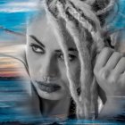 A striking portrait of a woman with braided hair, gazing thoughtfully. The image contrasts her with a vibrant sunset over the ocean, while she is rendered in black and white, highlighting her features.