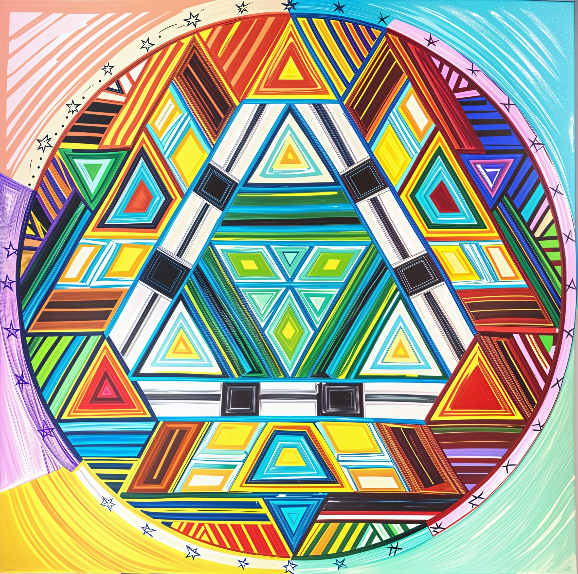A vibrant, mystical mandala featuring an alien face at its center, surrounded by colorful geometric patterns and cosmic elements, evoking a sense of otherworldly beauty and intrigue.