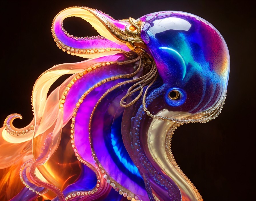 Prompt: "Octopus with a phoenix head, exhibiting a diaphanous, shimmering texture. This creature combines transparency with a high-gloss finish, creating a radiant, iridescent spectrum akin to stained glass in celestial light. Crafted in the visionary styles of Daniel F. Gerhartz, Gustave Dore, H.R. Giger, Tom Bagshaw, and Junji Ito, it stands as a surreal, biomorphic space wanderer. The design, reminiscent of H.R. Giger's work, is an ultra-detailed marvel, integrating the golden ratio into its hypermaximalist form, radiating an otherworldly elegance."
