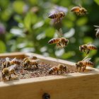 A vibrant scene of buzzing bees swarming around a wooden hive, surrounded by lush greenery. Some bees are actively collecting nectar while others hover in mid-air, showcasing their industrious nature.