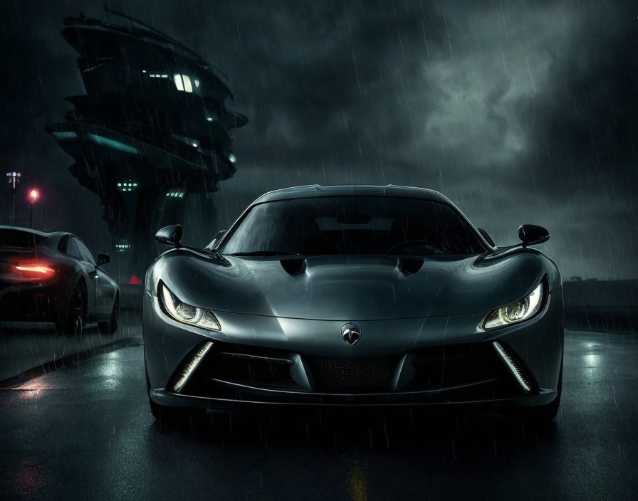 A sleek, dark sports car stands prominently in heavy rain, illuminated by ambient lights. A futuristic building looms in the background, enhancing the moody, dramatic atmosphere.
