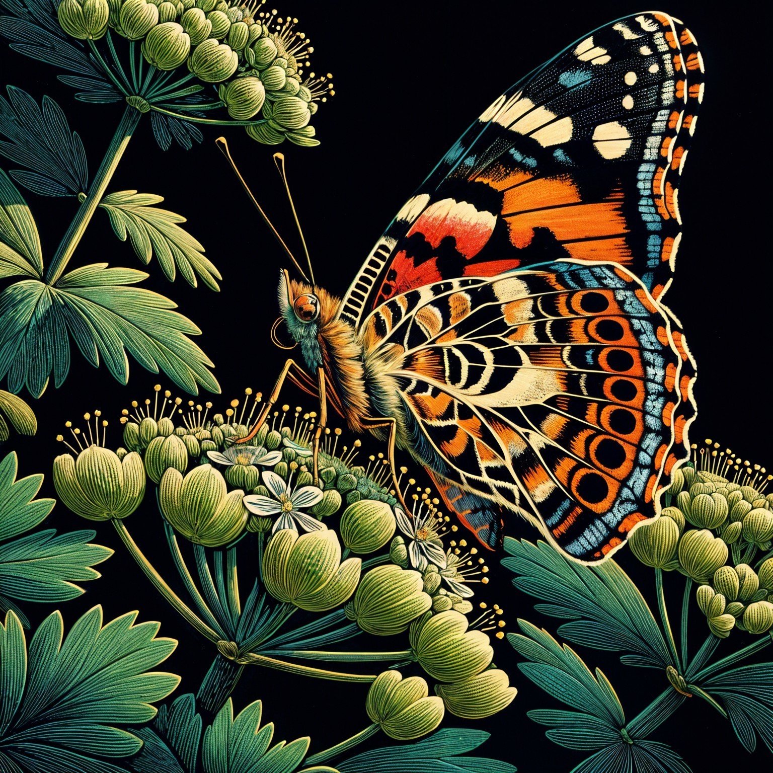 A beautifully detailed butterfly with vibrant orange and black patterns rests on lush green foliage, surrounded by delicate flowers and seed heads, all set against a striking black background.