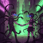 In a gritty, neon-lit alley, two punk characters with cybernetic enhancements grasp hands, surrounded by twisting tentacles in a vibrant, eerie green atmosphere.