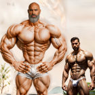 The image features two muscular men showcasing impressive physiques. One has a thick build with a beard, while the other is slightly smaller, highlighting their strength and definition against a blurred background.