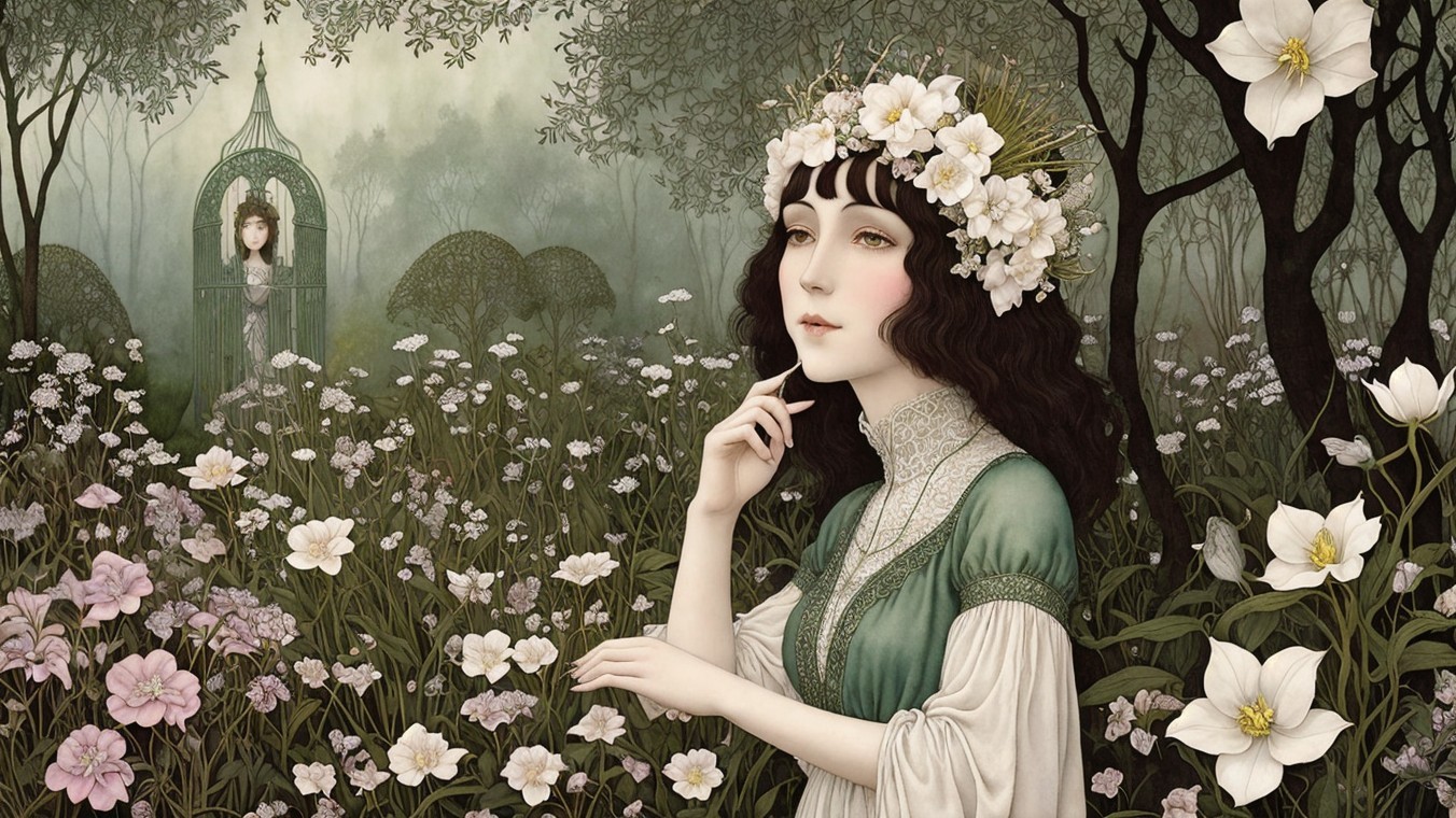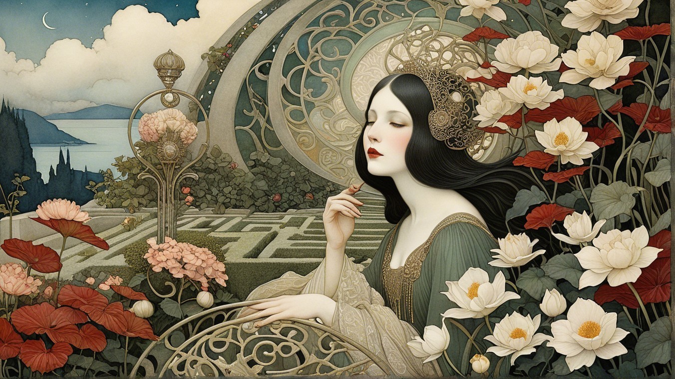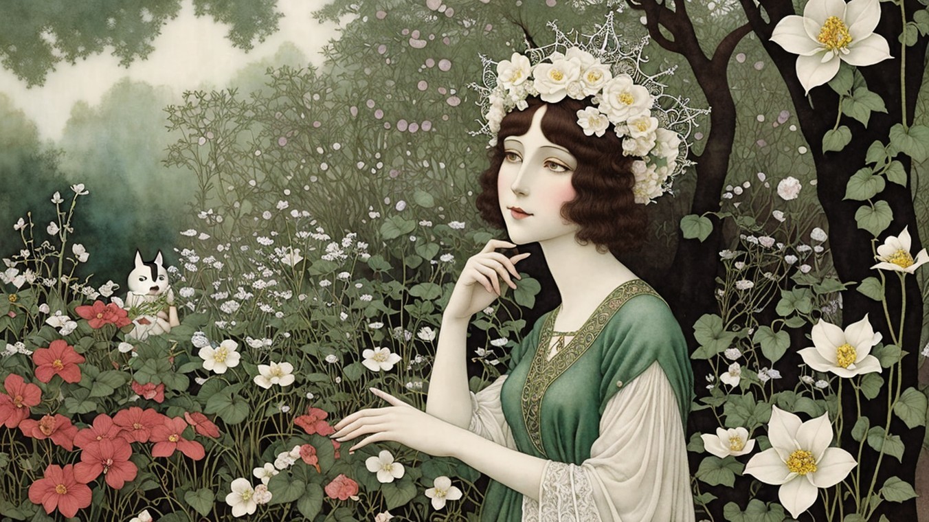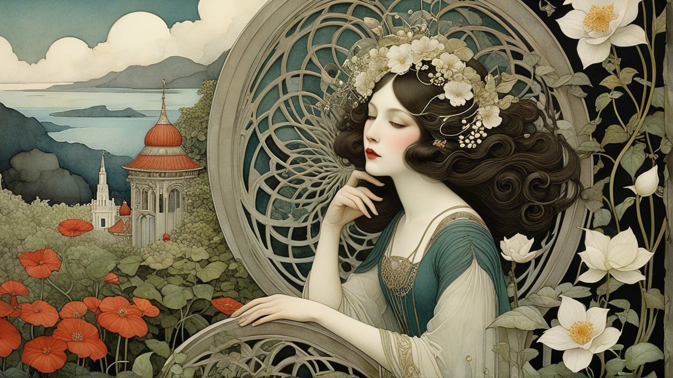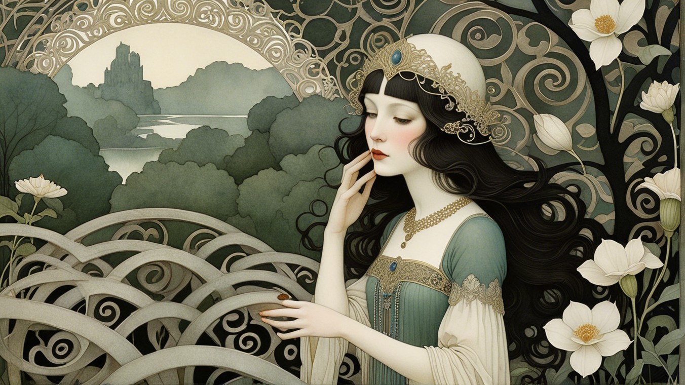 A serene, dreamlike scene features two women with flowing hair, adorned in elegant attire, and a mysterious man behind them. A cat observes as they sit among rocky formations by a tranquil landscape.