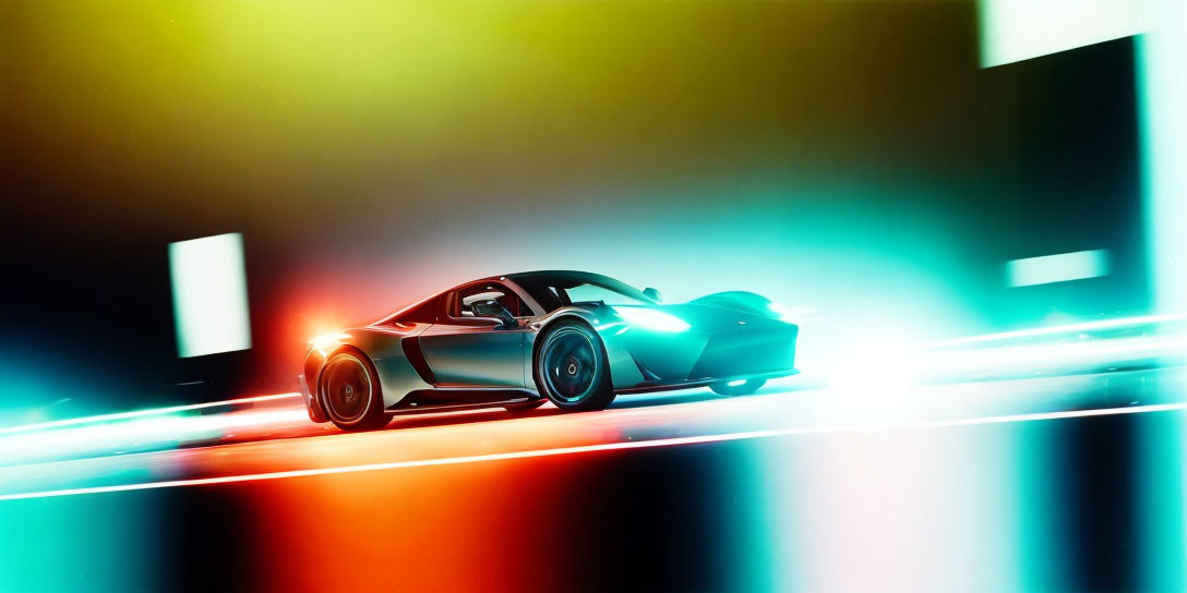 A sleek and powerful sports car racing through a futuristic cityscape, leaving a trail of motion blur behind. The car is depicted in dynamic motion, with a sense of speed and energy. The cityscape is filled with towering skyscrapers and vibrant lights, enhancing the futuristic atmosphere. Style: High-speed and futuristic. Colors: Deep shades of metallic gray and black, with vibrant pops of neon colors for the city lights.