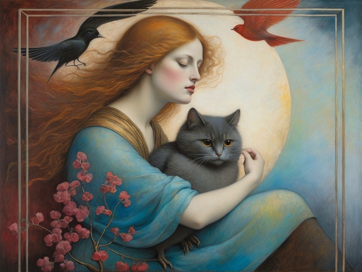 A serene woman with flowing red hair cradles a gray cat, surrounded by a blue backdrop. Birds flutter nearby, enhancing the peaceful, enchanted atmosphere of the artwork.