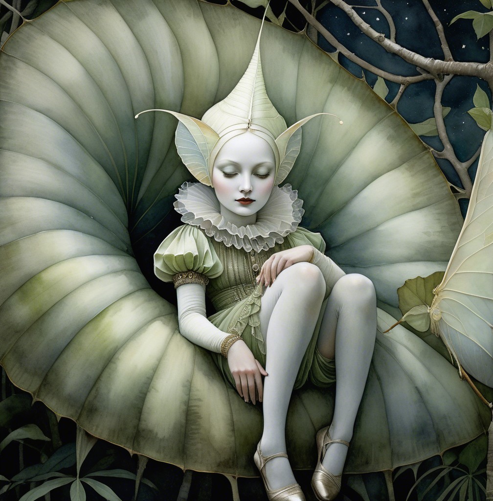 watercolor delicate sobriety fine lines in shades of gray and green watercolor and ink by Anton Mauve and Enki Bilal. Iridescent watercolor and ink By Jamie Heiden, Daniel Merriam, Paul Klee, Karol Bak, Dee Nickerson, extremely detailed, high definition, crisp quality, ultra detailed background . Close up, ghostly amused beautiful Amazonian Luna moth goddess in a jungle dreamscape in the style of Alexander Jansson. by Catrin Welz-Stein, Michael Parkes 3d, extremely detailed, beautiful, watercolor and ink, mixed media, Best quality, Very high definition, super clear resolution, cinematic, intricate, fantastic view, beautiful, dynamic lighting, high definition, hdr *Random prompt award winning Max Ernst ultra detailed, 4K 3D