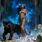 A powerful sorceress with long dark wavy hair, wearing a tribal teal bra, intricate jewelry, and a flowing skirt, adorned with full-body tribal tattoos and mystical blue glowing energy emanating around her head, stands next to a majestic black panther with glowing orange eyes and a subtle blue highlight on his