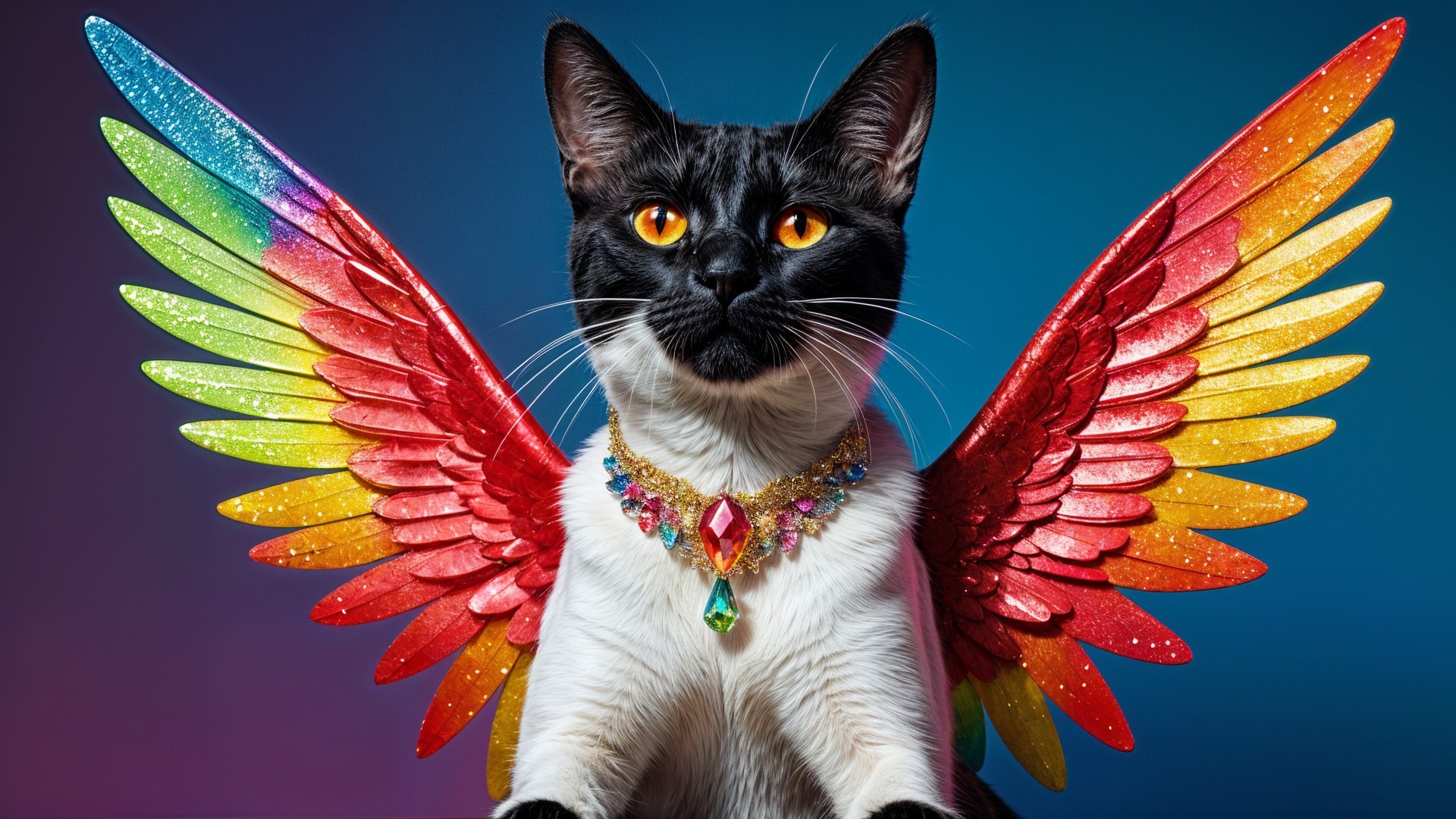 A charming cat with striking orange eyes, adorned with a colorful, rainbow-hued set of wings and a sparkling necklace, stands out against a vibrant blue background.