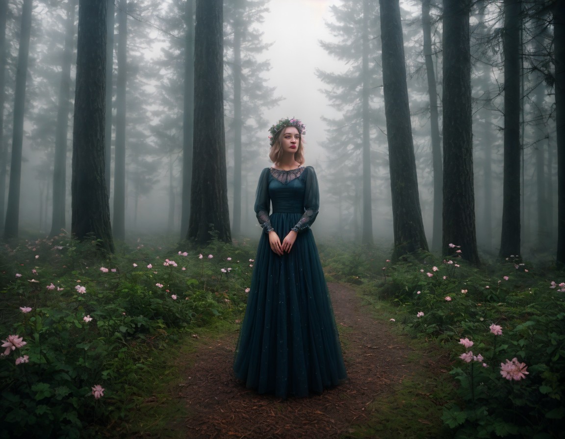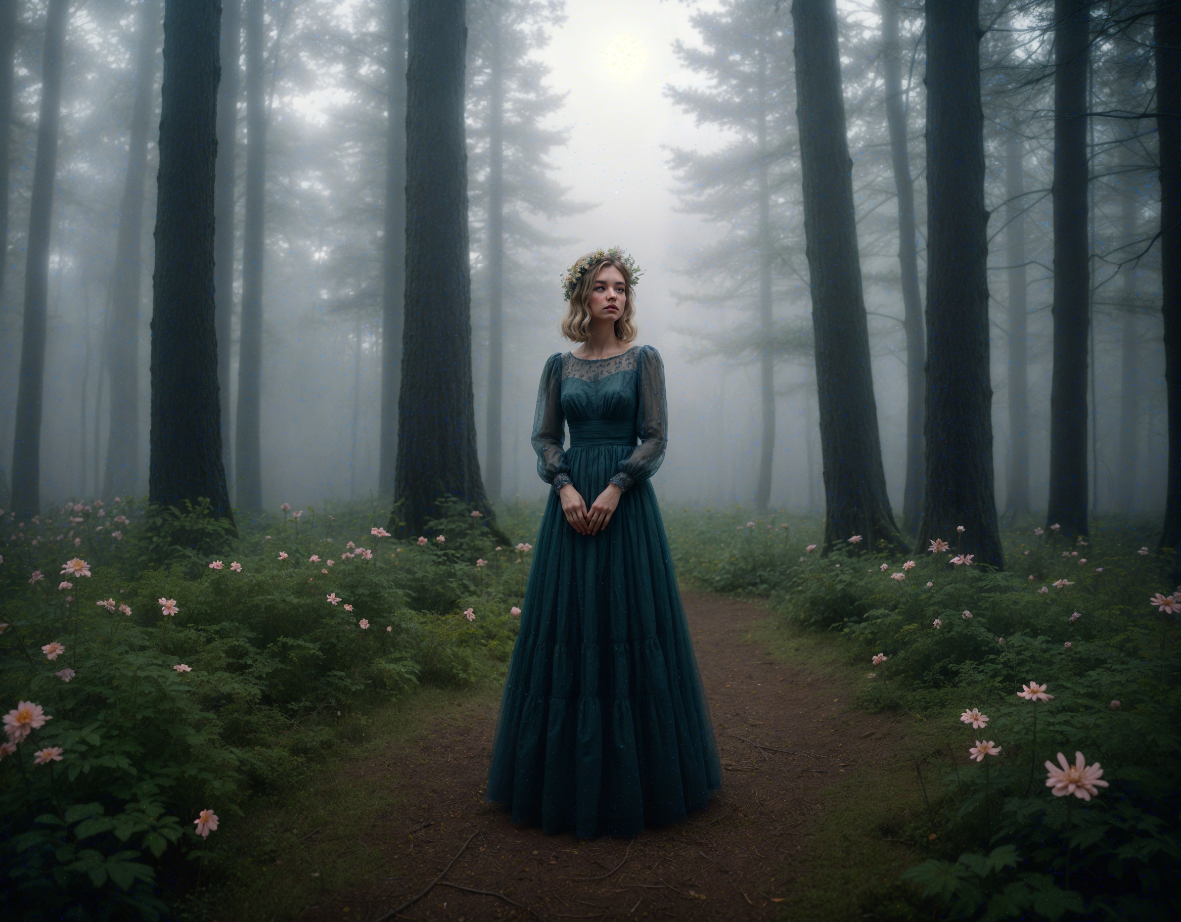 A young woman in a flowing teal dress stands quietly in a misty forest, surrounded by tall trees and delicate flowers. The atmosphere is enchanting and serene, evoking a sense of mystery.
