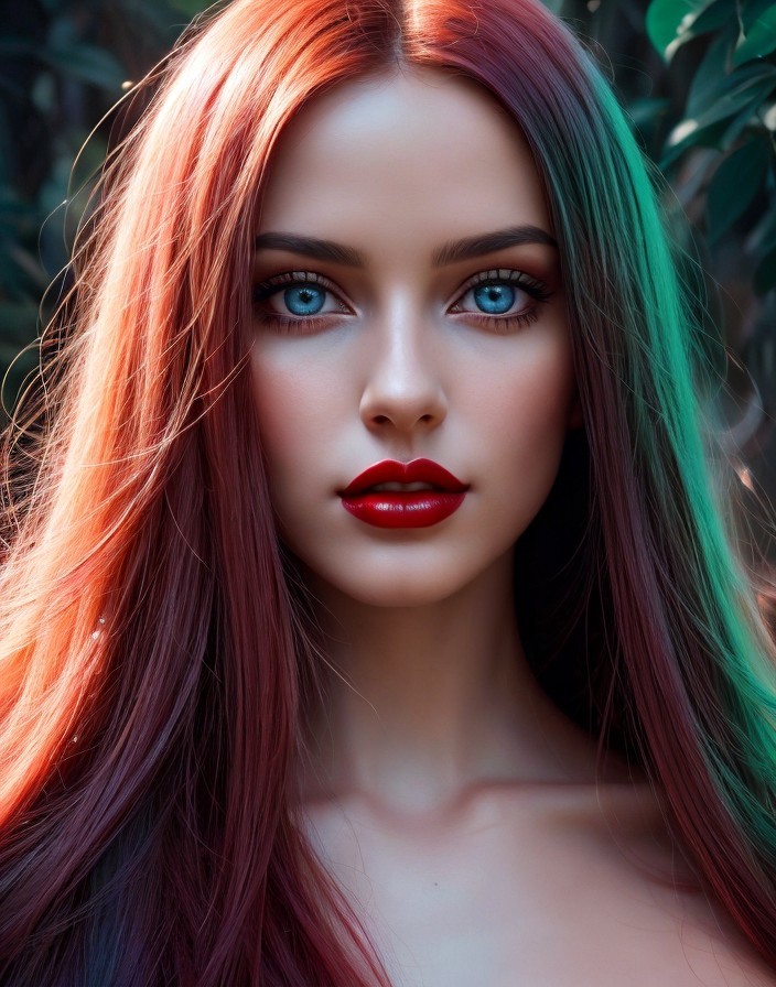 Prompt: analog film grain, beautiful glamour model woman, anatomically correct body, symmetrical face, red lips, stunning and mesmerizing eyes, long glossy and shiny hair, colorful hair, juxtaposition of light and shadow, strong facial expression, illustration, Generative AI, whimsical, dream, dreamy, dreamlike, dreamscape,