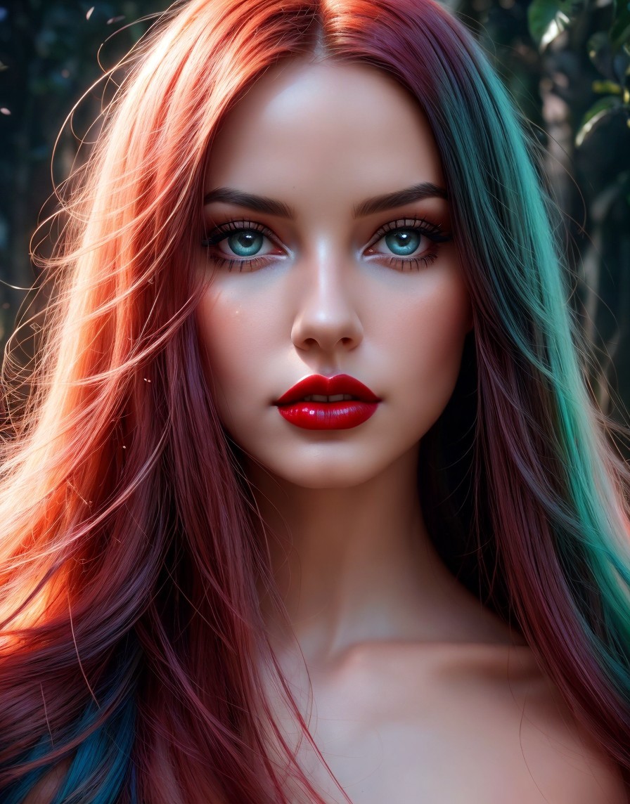 analog film grain, beautiful glamour model woman, anatomically correct body, symmetrical face, red lips, stunning and mesmerizing eyes, long glossy and shiny hair, colorful hair, juxtaposition of light and shadow, strong facial expression, illustration, Generative AI, whimsical, dream, dreamy, dreamlike, dreamscape,