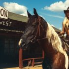 A confident woman rides a stunning black horse along a sunny rural road. She sports a sporty outfit with a crop top and denim shorts, her hair flowing in the breeze against a picturesque backdrop.