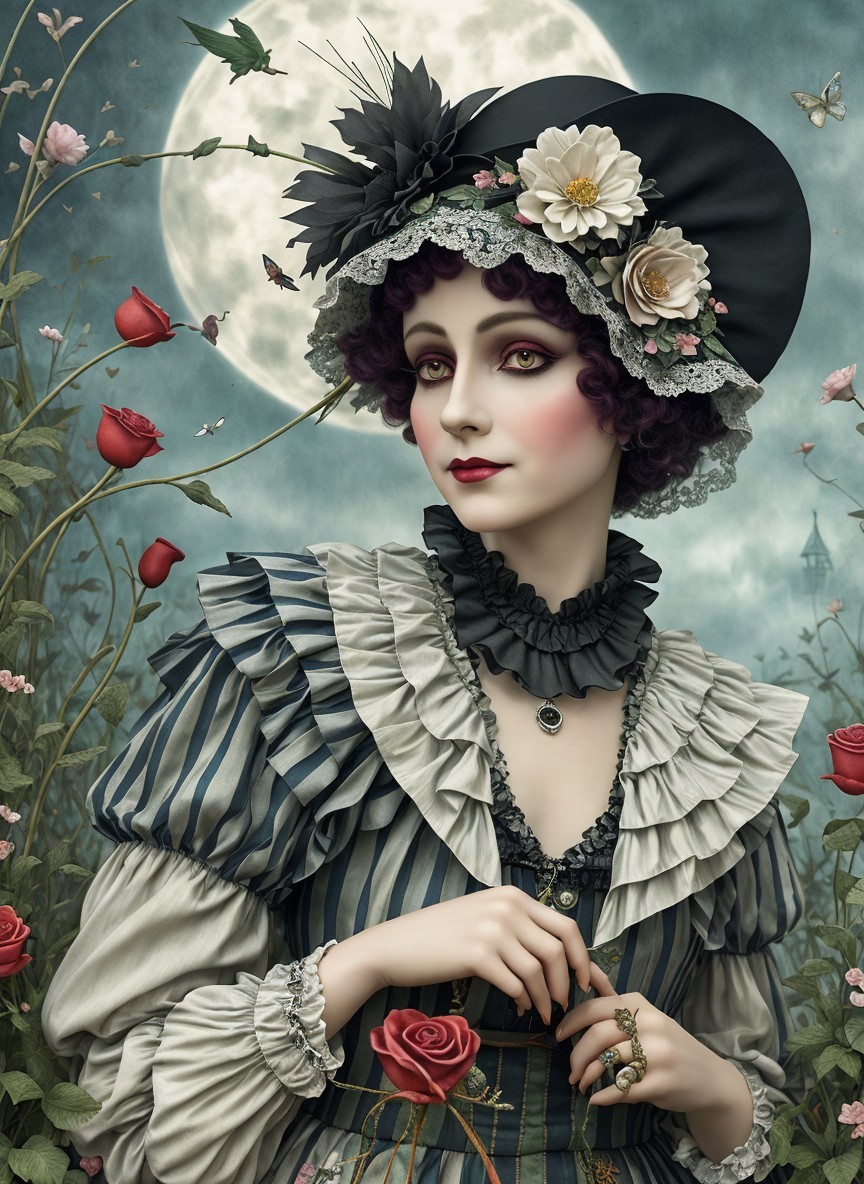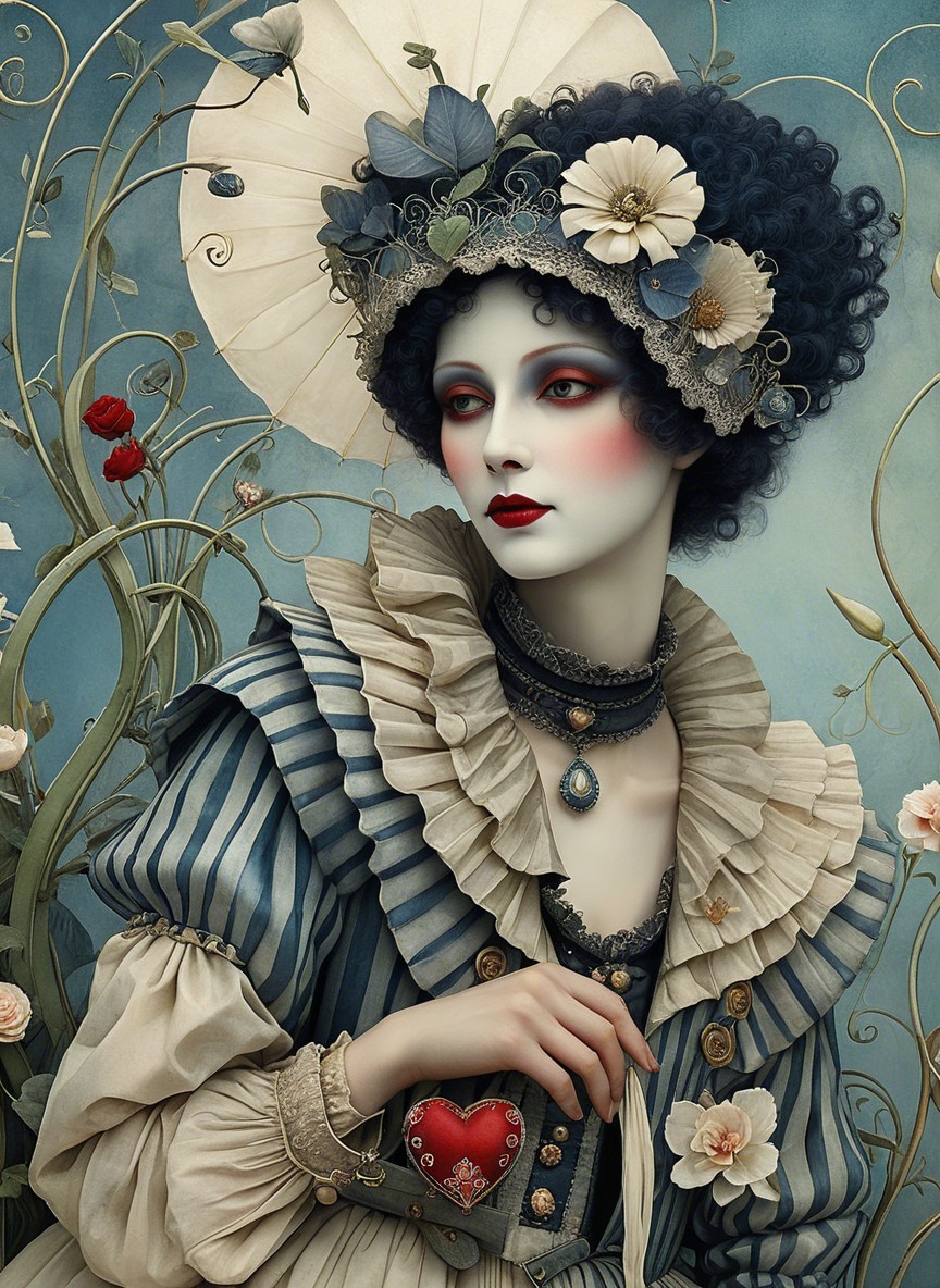 Close up, impish devious Pierrot creature in a valentine garden maze, in the style of Alexander Jansson. by Catrin Welz-Stein, Michael Parkes
