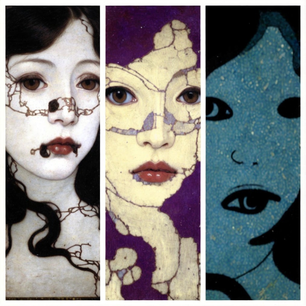 A triptych of a female face evolving from classical painting to a fragmented mosaic and finally into a stylized, modern, graphic representation.