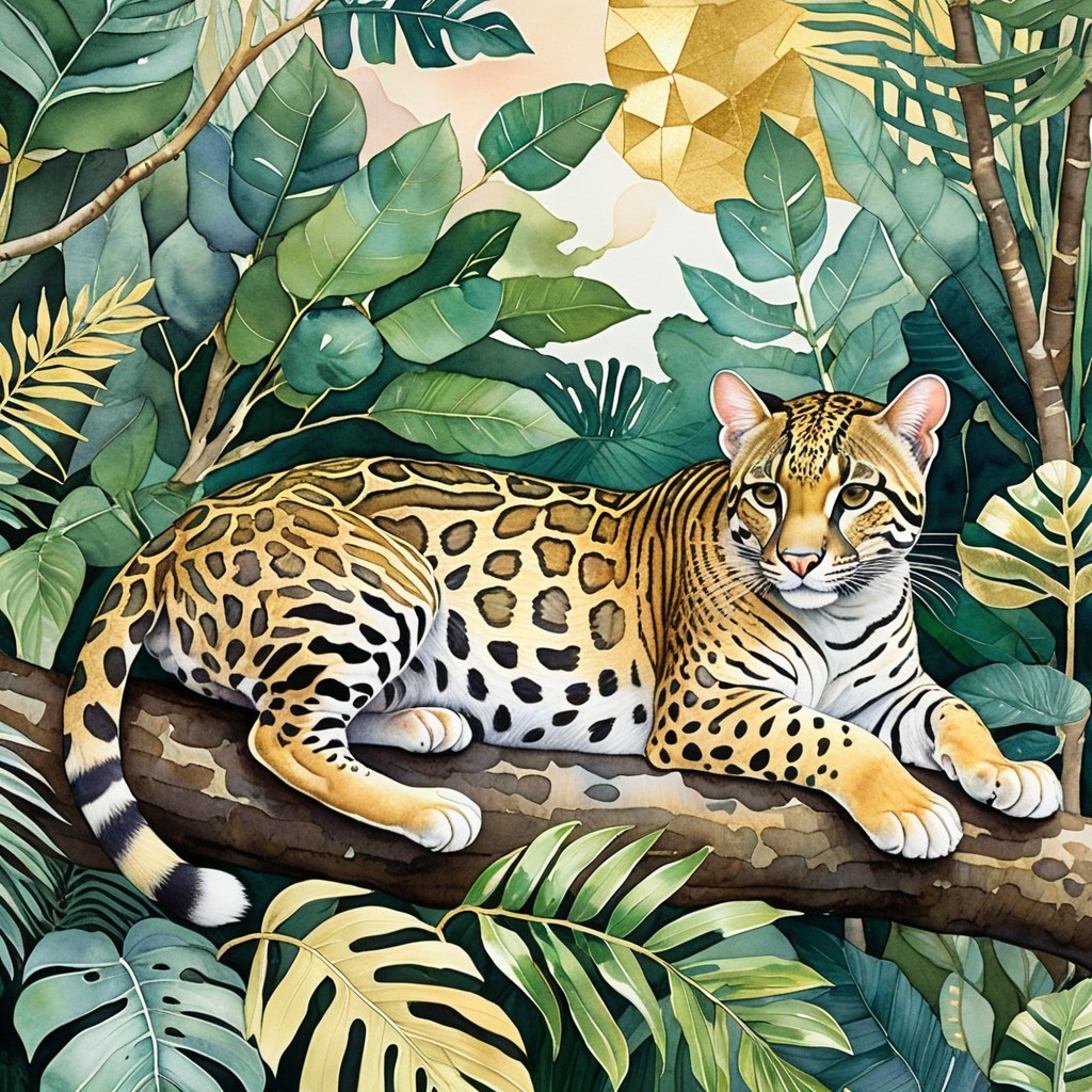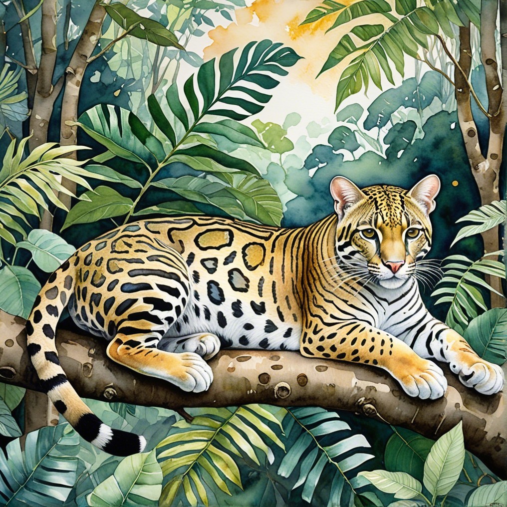 An illustrated ocelot lies on a tree branch surrounded by lush, green tropical foliage, with a soft, watercolor background.
