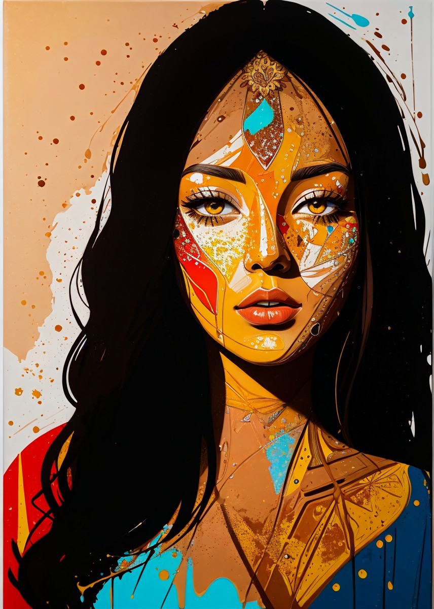+ Prompt:Acrylic painting, stylized Portrait, zentangle style surrounding, luminous brightness 1.2, splash art, spilled, drippings, 3d splatter effects, triadic color scheme brown ochre red, detailed crackles, tiny fine lines, dropped paint, dripping art style, gilded plushy lines, highlighted reflections on drippings, but the style of 1970s advertising art is a solid unlined portion of the icy swamp surrounding area, bottom to top angle, llustrative maximalism,tints of Surreal digital painting, spiritual essence, led, color spill,