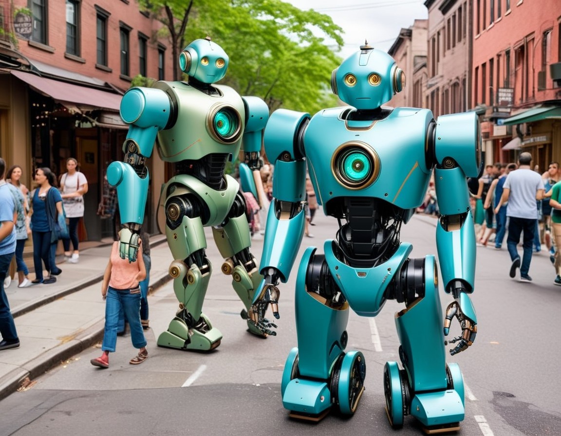 Three humanoid robots with blue and gold coloring are walking down a bustling pedestrian street among humans on a sunny day.