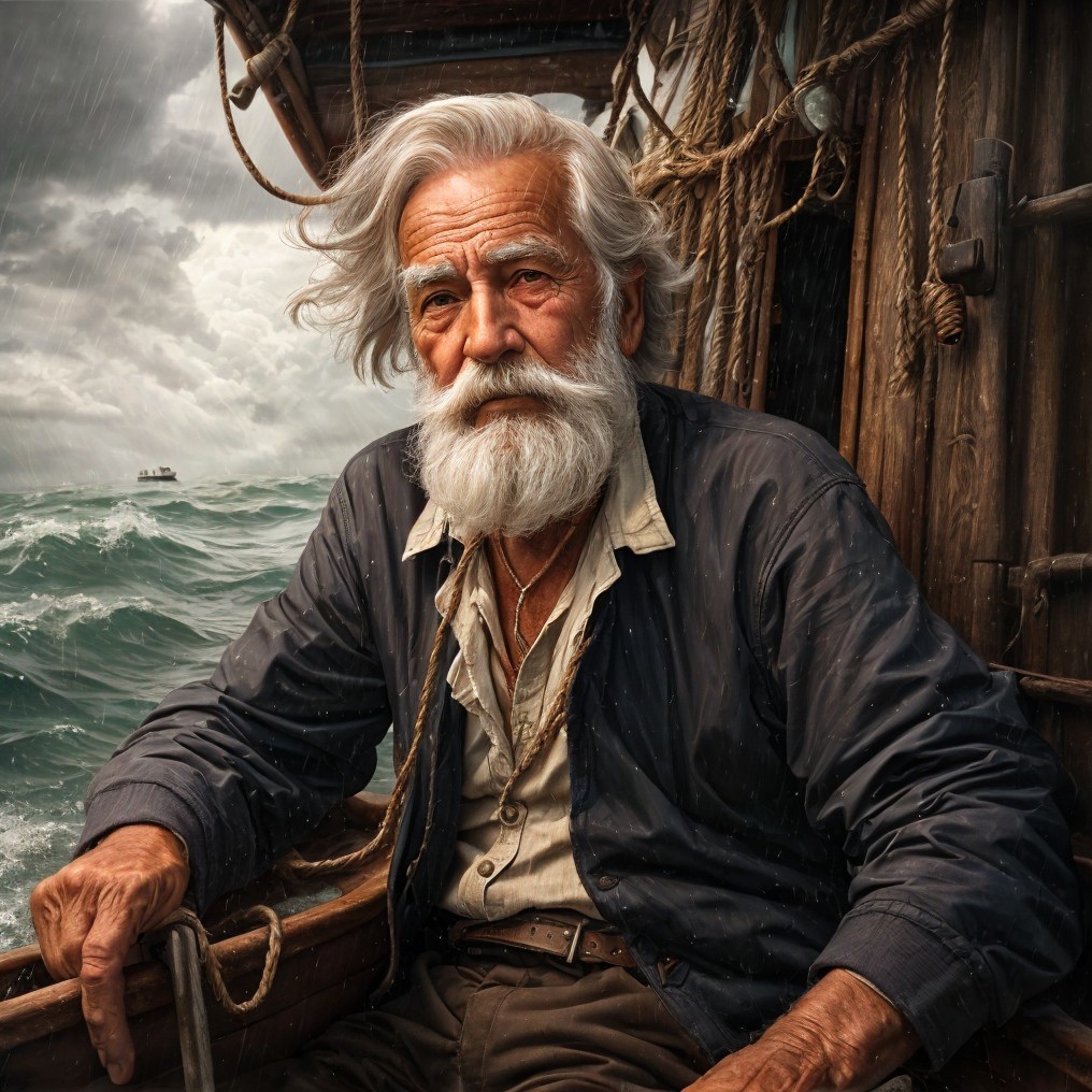 Elderly bearded sailor in blue jacket navigating stormy seas