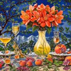 3D, still life on rough paper, half relief, extremely detailed painted red, yellow and orange flowers in a vase with a large blossom stands on a table with an old tablecloth, drinking glasses half filled with juice and white wine, champagne glasses, peaches, in the background bushes, snowy mountains, blue time, deep blue sky with fluffy clouds, inspired by Max Liebermann