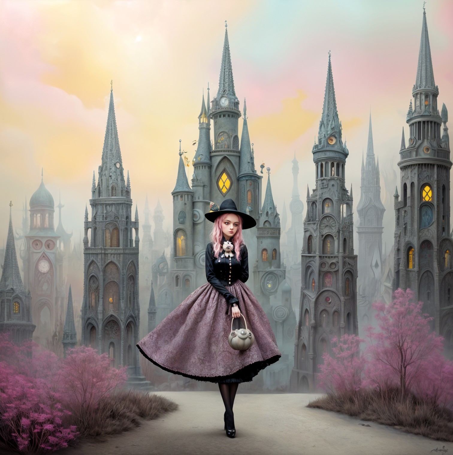 (Try from Moonhorse) - A young woman with pink hair in a Victorian dress stands in a fantastical landscape, with towering, gothic castles and pastel skies. She clutches a doll, surrounded by ethereal pink flora.