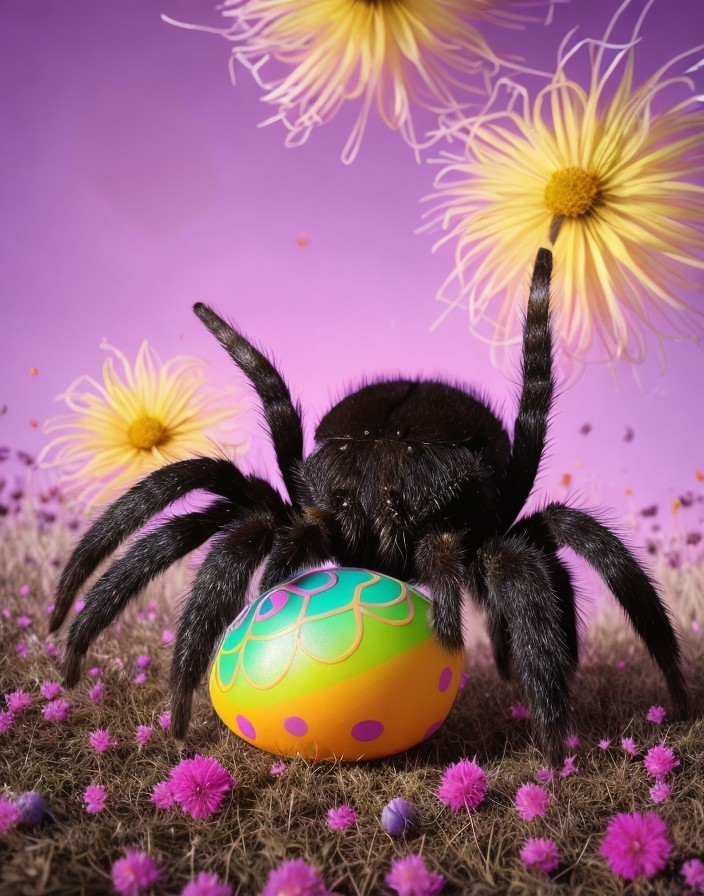 Whimsical Spider Holding Colorful Easter Egg in Flowers