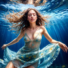A woman poses gracefully against a textured blue backdrop, wearing a fitted top and minimalist underwear, her hair flowing softly as she embodies elegance and artful expression.