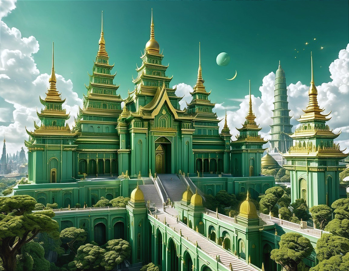 Prompt: "Visionary masterfully surreal scene set in a futuristic city landscape. In the background, a grand, futuristic oriental temple style castle with green spires and golden embellishments dominates the cityscape. Visionary masterfully surreal scene set in a futuristic city landscape. In the background, a grand, futuristic castle with golden spires and golden embellishments dominates the cityscape. Show a very attractive and beautiful elegantly dressed steampunk escort girl in a long skirt in fullbody portrait with middle-age inspired coat clearly put in the foreground and set against a fantastical futuristic city landscape and watching at the spectator with an inviting facial expression and gesture in a challenging way. Steampunk aesthetic, soft lighting, metallic surfaces, Jean-Baptiste Monge, Klimt, Bosch painting style, floral motives, glowing colors, surrealist atmosphere, Morning Glory Flower patterns. Paint their cloths in regal victorian style with silky dark red and dark green and very precious fabrics, delicately covered with mystical green shining gemstones and jewelry and intricate floral ornaments embroidered clothes. Put a clear focus on the mainfigure without loosing the deepness of the background landscape. Add some beautiful burning poplars, mystical symbols, the fibonacci suite following organic structures, apply golden ratio for entire composition, refine and enlarge a deep surreal landscape in the background, paint the image and 9:16 or 3:4 format"
