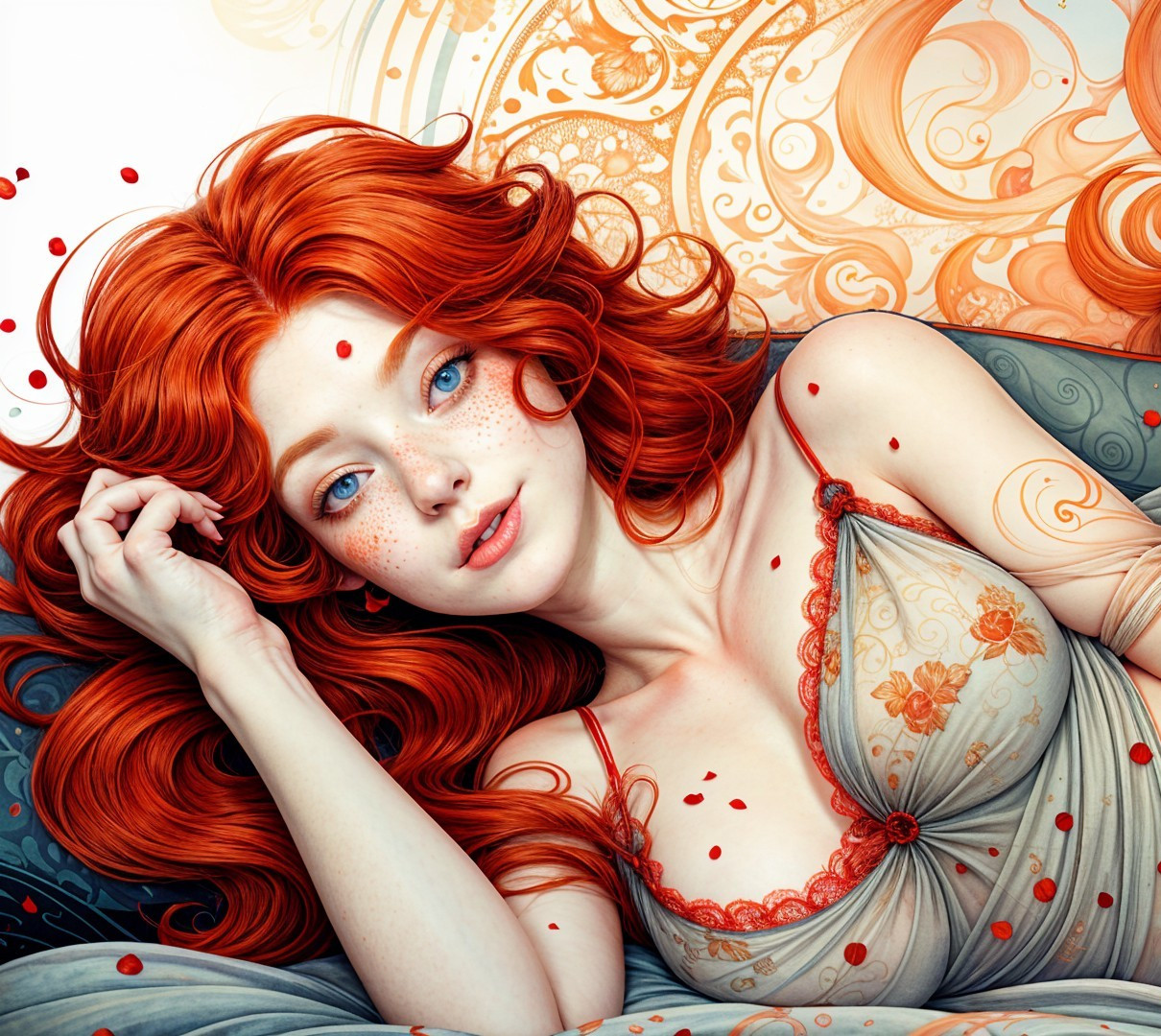 A vibrant, fantasy-style illustration featuring a young woman with flowing red hair, bright blue eyes, and freckles, adorned in a delicate floral dress, surrounded by swirling patterns and petals. Art Nuveau style