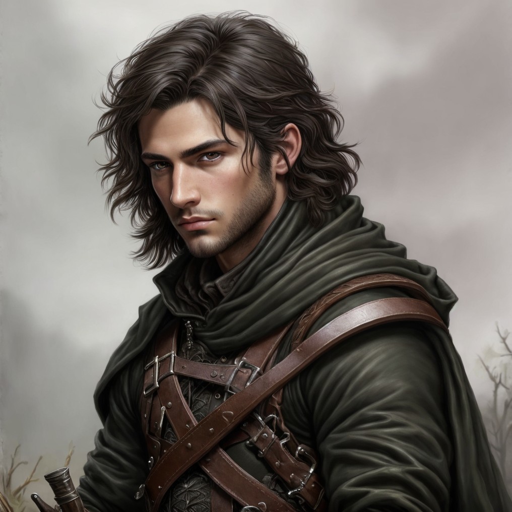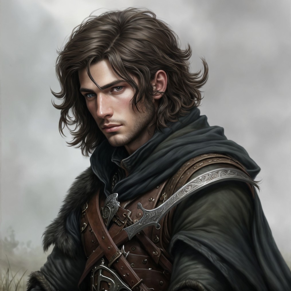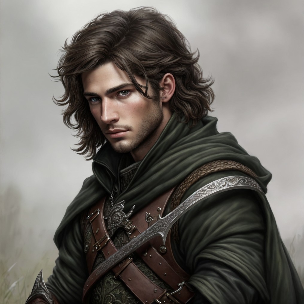 Fantasy male warrior digital artwork: long hair, stern gaze, green cloak, leather armor