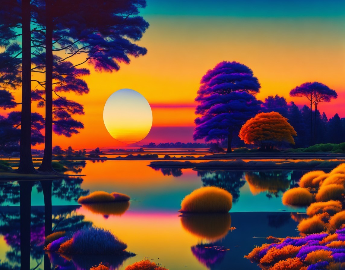 Prompt: Create a vibrant, surreal landscape at sunset with a color palette of oranges, yellows, purples, and blues, featuring a variety of stylized, round-topped trees. Near the foreground, include a mirror-like body of water reflecting the vivid scene. At the center, a perfectly round setting sun hovers over the horizon, casting a warm glow across the sky and water. The silhouette of a large tree with intricate branches occupies the left side, while flowing hills covered in topiary-like vegetation extend into the distance on the right. The overall atmosphere should be peaceful and dreamlike with a clear distinction between the warm tones of the sunset and the cool shades of the surrounding landscape.