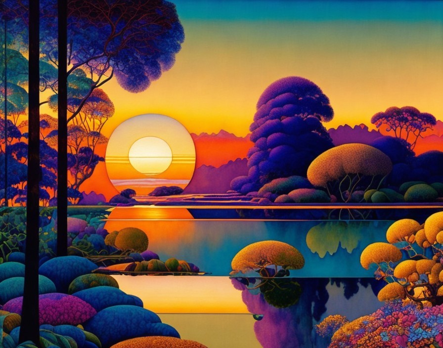 Create a vibrant, surreal landscape at sunset with a color palette of oranges, yellows, purples, and blues, featuring a variety of stylized, round-topped trees. Near the foreground, include a mirror-like body of water reflecting the vivid scene. At the center, a perfectly round setting sun hovers over the horizon, casting a warm glow across the sky and water. The silhouette of a large tree with intricate branches occupies the left side, while flowing hills covered in topiary-like vegetation extend into the distance on the right. The overall atmosphere should be peaceful and dreamlike with a clear distinction between the warm tones of the sunset and the cool shades of the surrounding landscape.