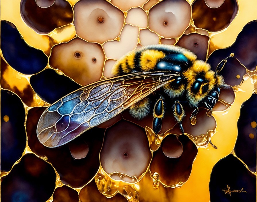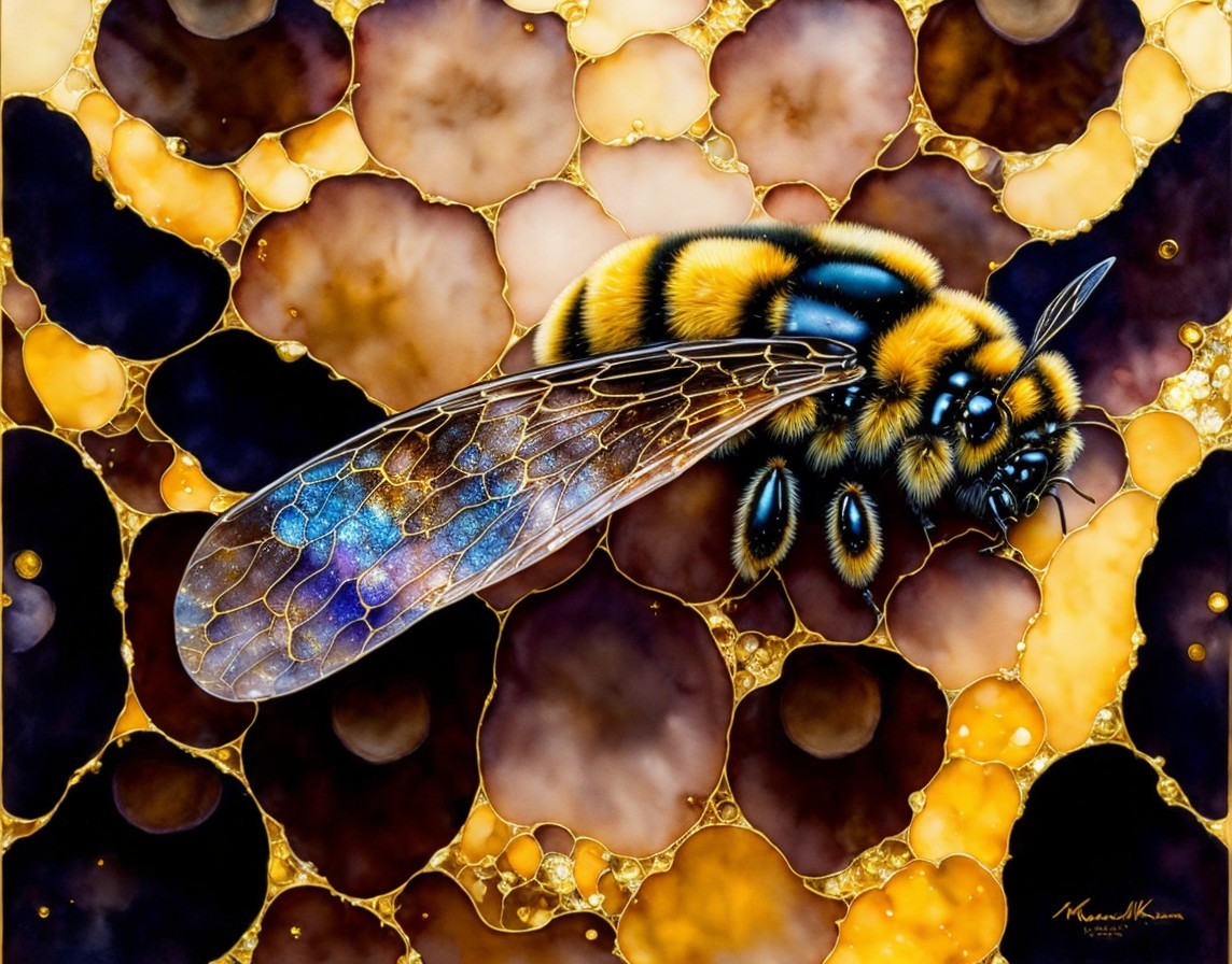 A vibrant digital artwork of a bee with translucent wings on a background of golden honeycomb and purple flowers.