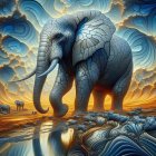 A majestic elephant stands amid a surreal landscape of swirling colors and textured patterns, with a dramatic sunset reflecting in the water. Smaller elephants are seen in the background.