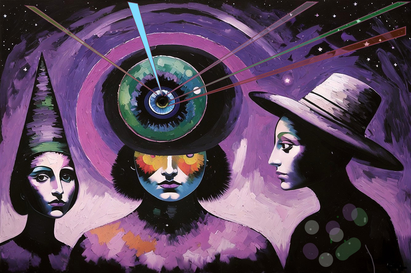A painting of three stylized female faces with cosmic elements, vibrant colors, and surreal accessories on a starry background. Somewhat purpleish colors for some reason.