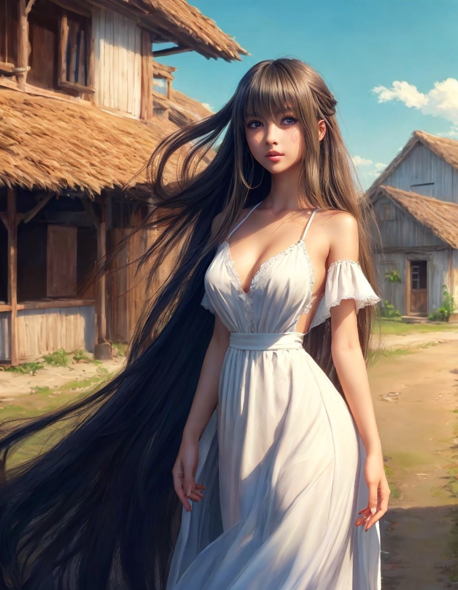 A woman with long flowing hair in a white dress stands before a rustic wooden building, with a clear sky above.