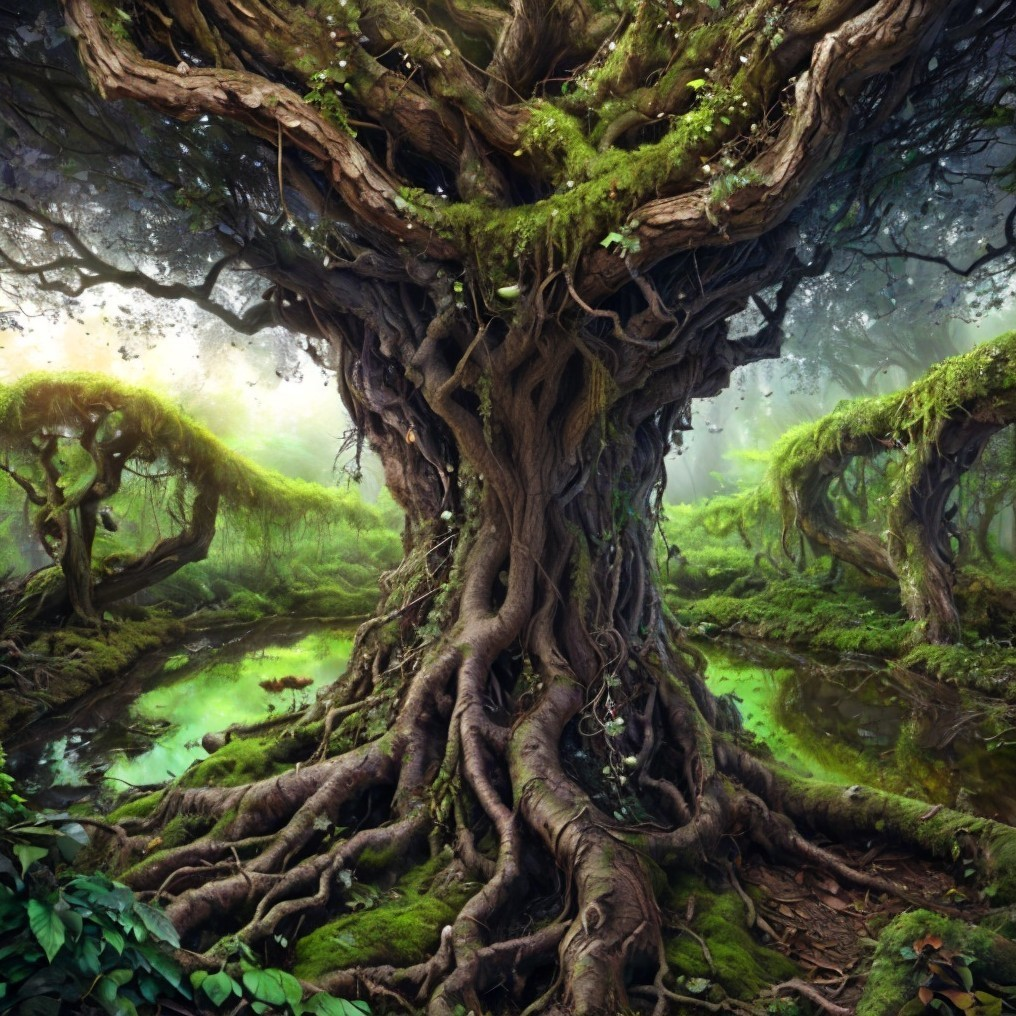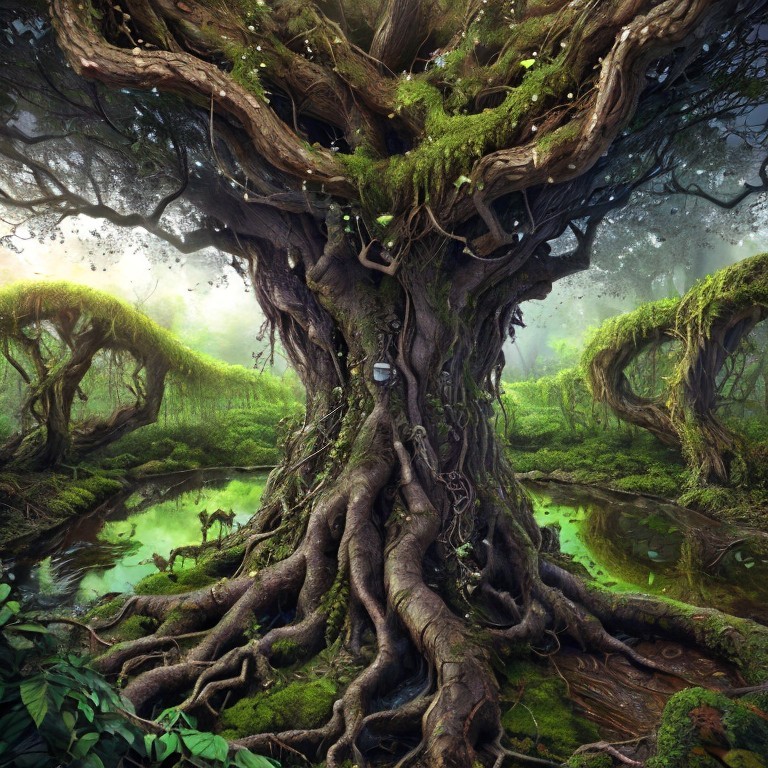 An ancient, twisted tree with lanterns set in a lush, mystical forest bathed in soft light, with verdant foliage and tangled roots.