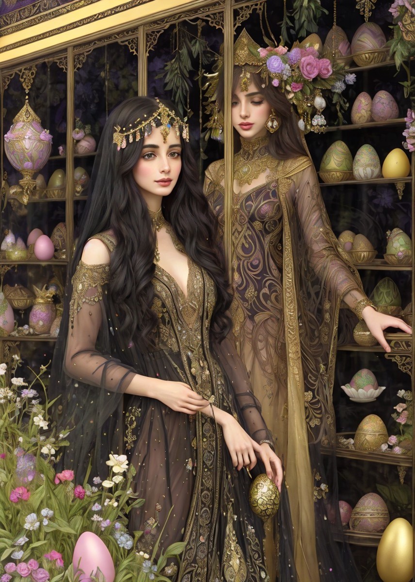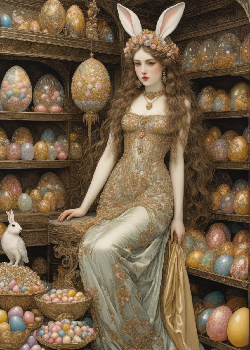 A woman with bunny ears and a floral crown sits before a backdrop of colorful Easter eggs, evoking a serene and whimsical aura.