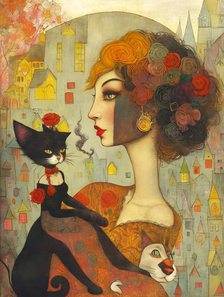 A whimsical illustration of a woman with a mosaic-patterned hairstyle alongside two stylized cats, set against a backdrop of colorful, quaint houses.