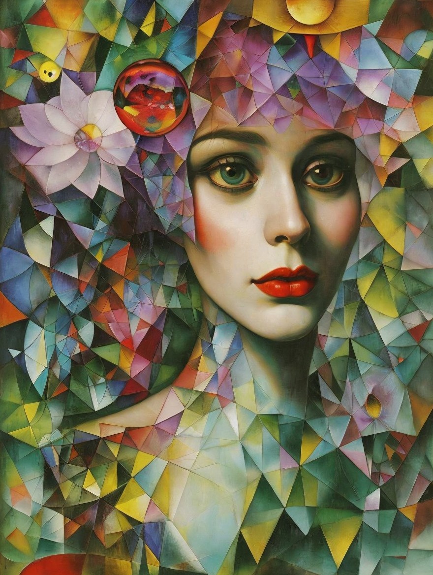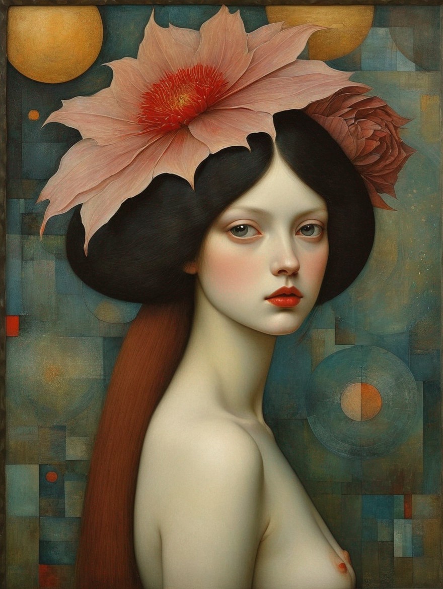 A painting of a pale woman with black hair, wearing an orange hat, with a surreal polka-dot background.