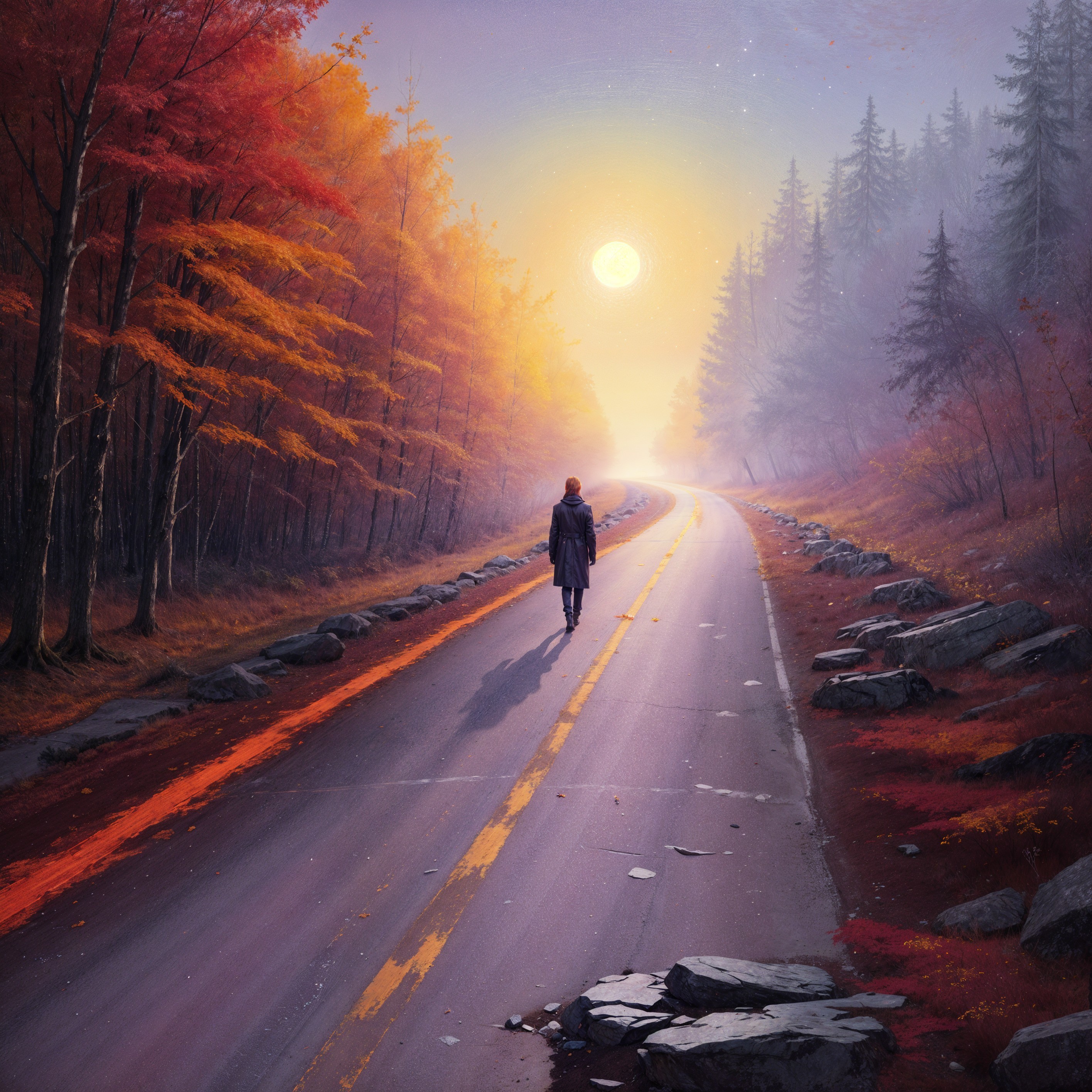 + Prompt:A serene, otherworldly scene depicting a solitary figure walking along a deserted road that stretches into a luminous, ethereal glow of light at the horizon. The background features vibrant trees with fiery red and orange leaves, suggesting a mystical autumnal forest. The road is paved, marked with faint yellow lines and scattered with small rocks and debris, creating a sense of abandonment.
