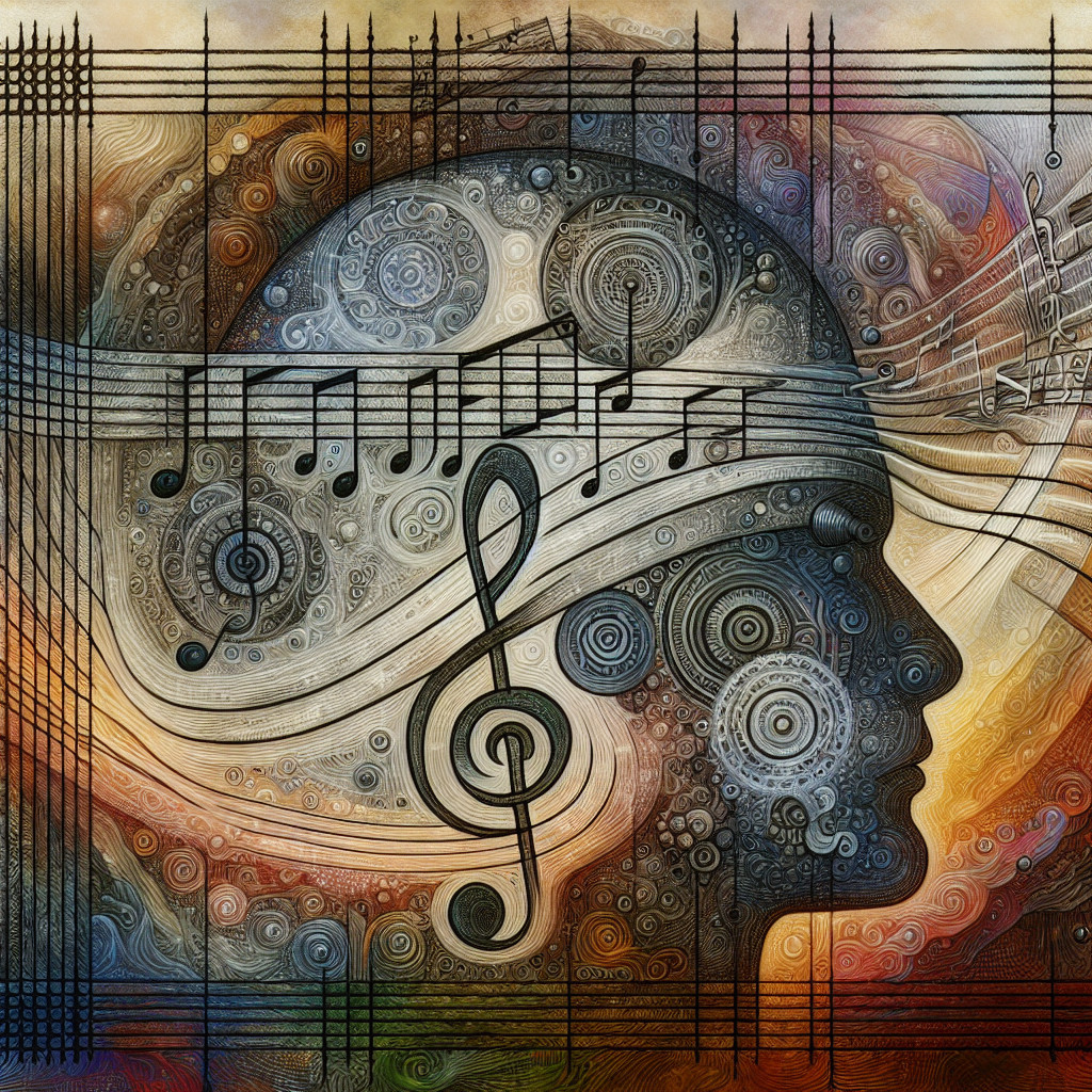 The image features a colorful, abstract profile of a human head filled with musical notes and intricate gears, symbolizing the connection between music, creativity, and intricate thought.
