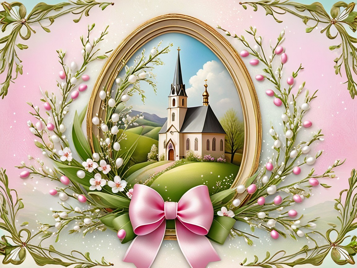A serene landscape features charming white churches with tall spires, surrounded by lush greenery and blooming pink flowers, creating a dreamy, picturesque scene filled with nature's beauty.