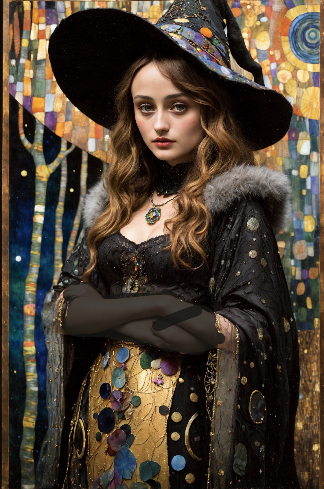 Prompt: Ella Purnell as a witch in the woods, by Gustav Klimt, Egon Schiele, Paul Klee mixed media, depth of field, parts of background is cosmic nightsky, metallic ink details and realistic textures created by Dave McKean and Richard Corben