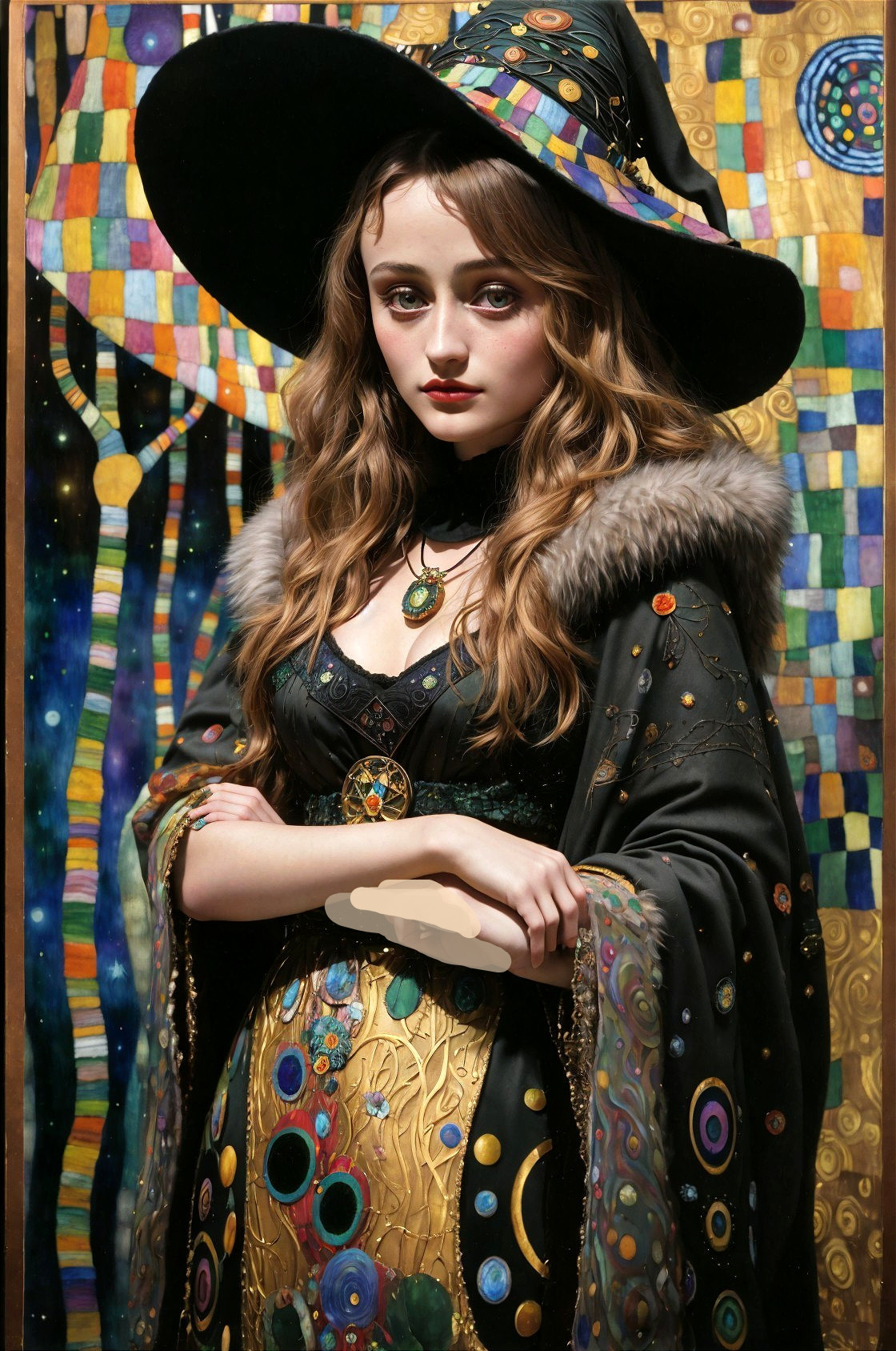 + Prompt:Ella Purnell as a witch in the woods, by Gustav Klimt, Egon Schiele, Paul Klee mixed media, depth of field, parts of background is cosmic nightsky, metallic ink details and realistic textures created by Dave McKean and Richard Corben