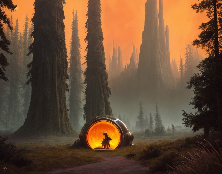 A lone figure stands before a large, glowing orb in a surreal landscape of towering, ancient trees. The atmosphere is ethereal, with a hazy orange glow illuminating the scene.