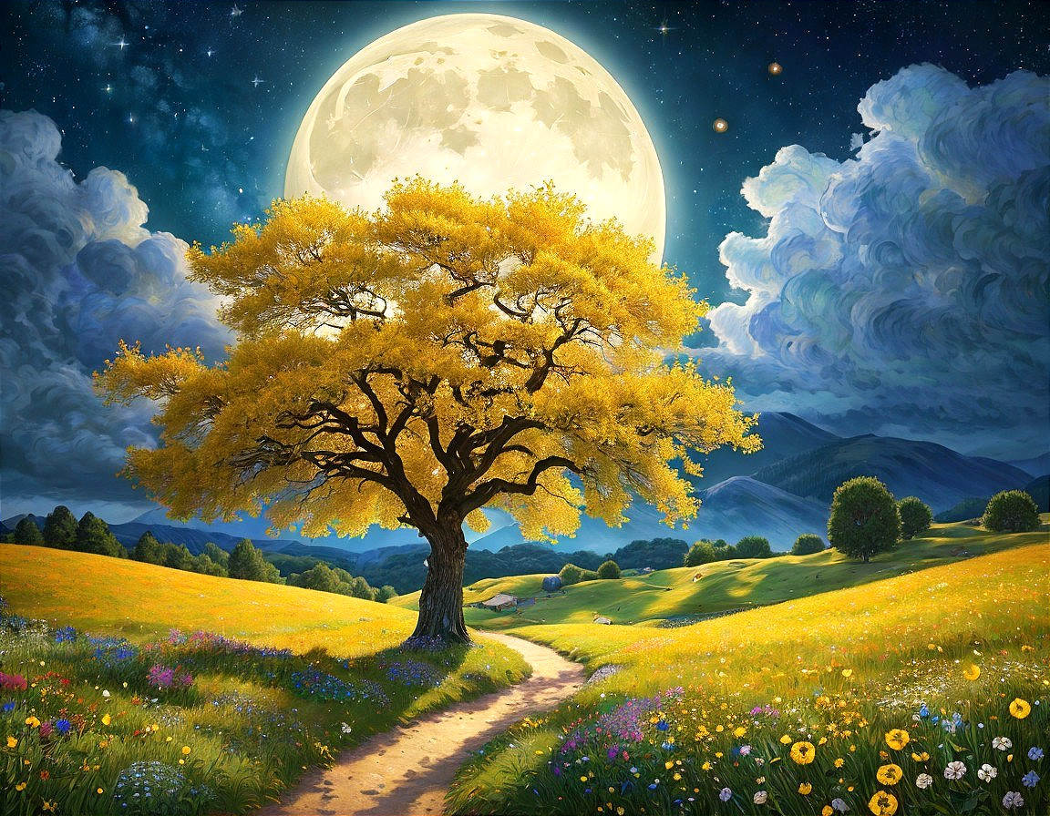 A vibrant landscape with an illuminated tree under a full moon, surrounded by a flower-filled meadow, winding path, and starry sky.