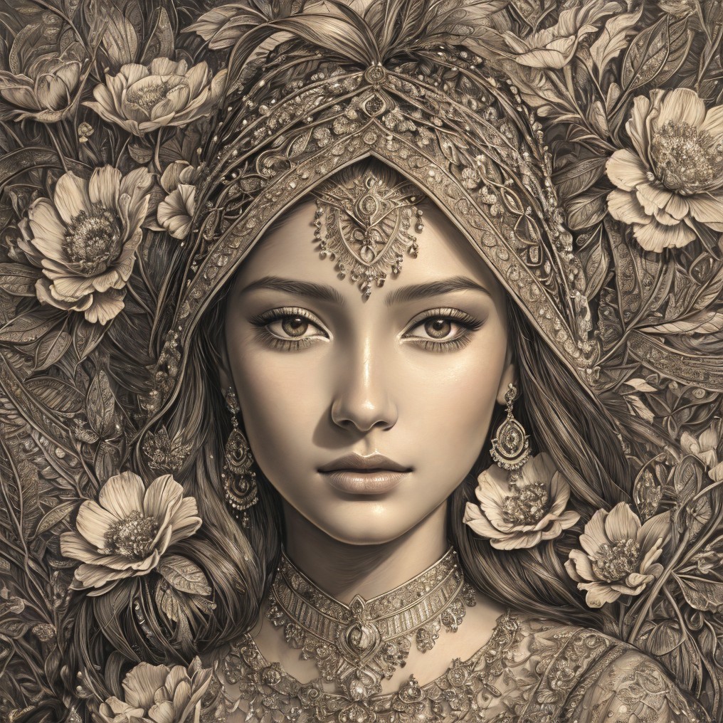 Monochrome illustration: Woman with intricate jewelry and floral backdrop