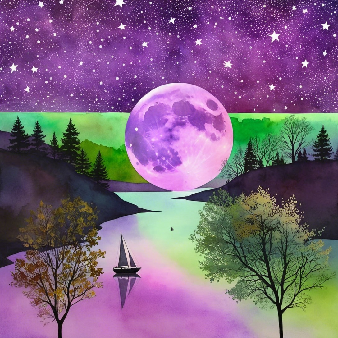 A vibrant watercolor landscape features a large purple moon illuminating a serene river. Silhouetted trees frame the scene, with a small sailboat reflected in the tranquil water beneath a starry sky.
